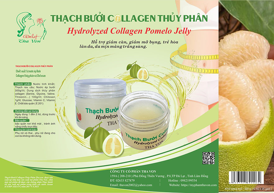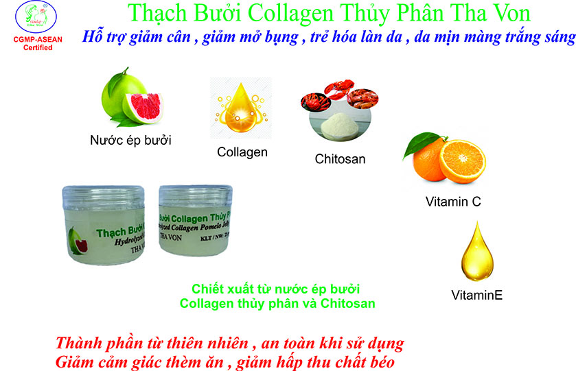 Thạch Bưởi Collagen Thủy Phân Tha von được sản xuất tại nhà máy sản xuất mỹ phẩm Tha Von , nhà máy mỹ phẩm đã được cấp chứng nhận Thực hành tốt sản xuất mỹ phẩm trong khối các nước Asean ( CGMP-ASEAN ) năm 2017 VÀ 2021 .